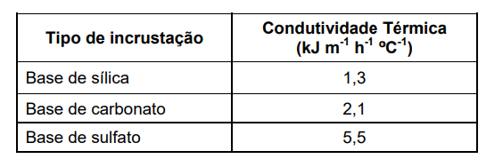 As caldeiras são utilizadas para alimentar máquinas nos mais diversos processos industriais, para esterilização de equipamentos e instrumentos em hospitais, hotéis, lavanderias, entre outros usos. A temperatura elevada da água da caldeira mantém compostos solubilizados na água de alimentação que tendem a se depositar na superfície de troca térmica da caldeira. Esses depósitos, ou incrustações, diminuem a eficiência do equipamento e, além de aumentar o consumo de combustível, podem ainda resultar em explosões. A tabela e a figura a seguir apresentam, respectivamente, informações sobre alguns tipos de incrustações em caldeiras, e a relação entre a espessura da incrustação e o consumo de combustível para uma eficiência constante.